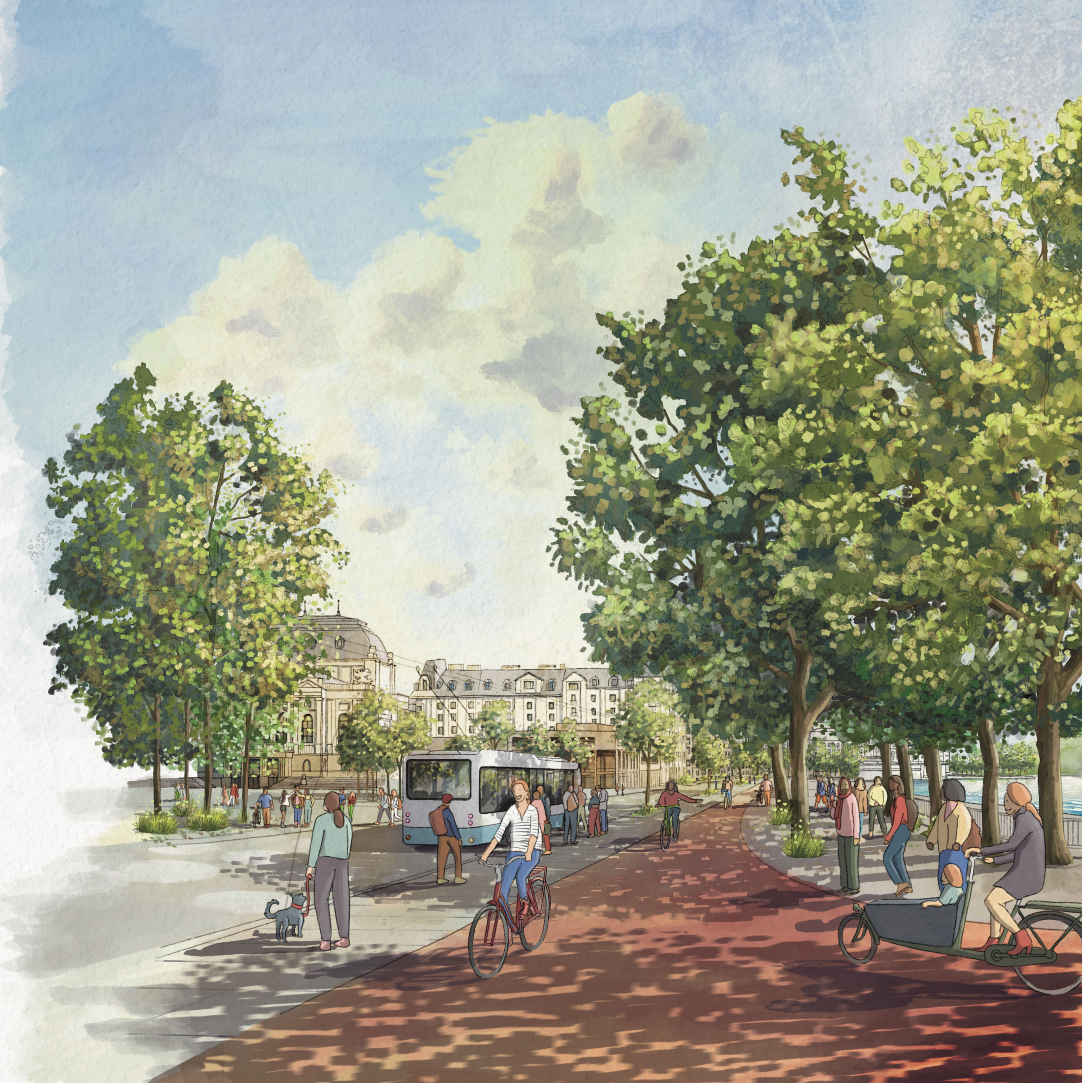 Through site analysis and dialogue, the proposal explores how these functions might coexist more harmoniously. By reducing traffic and strengthening links to the bike network, the design opens new possibilities for safer and more balanced urban life. The illustration imagines a reorganization that creates breathing room for all users while reconnecting residents with their lakefront heritage.
